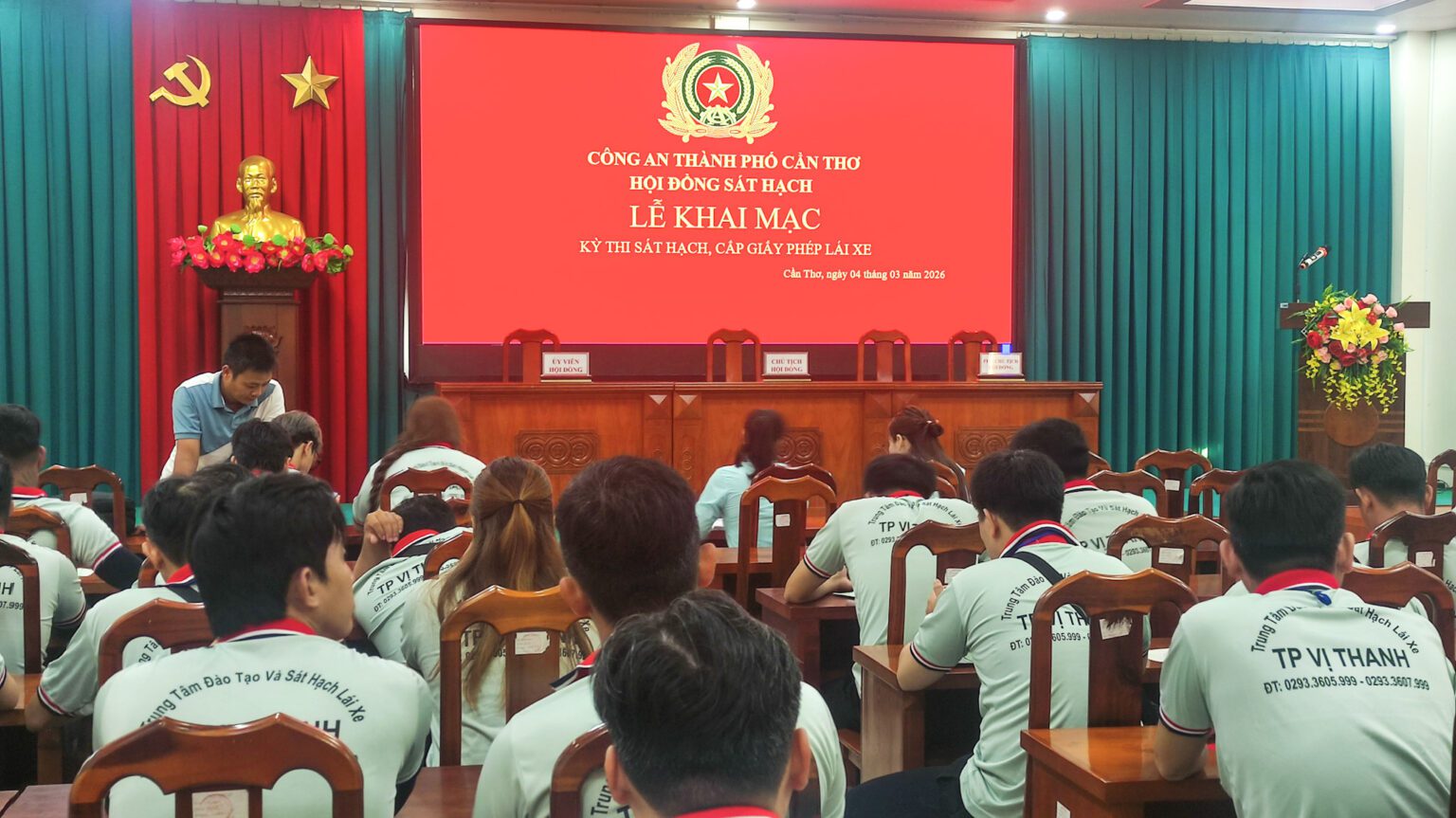 Các học viên tập trung tại hội trường theo đúng thời gian quy định để tham dự buổi khai mạc kỳ sát hạch. Không khí tại hội trường thể hiện sự nghiêm túc nhưng cũng xen lẫn sự hồi hộp của các thí sinh trước khi bước vào từng phần thi. Tất cả học viên đều lắng nghe và thực hiện theo sự hướng dẫn của cán bộ trung tâm.